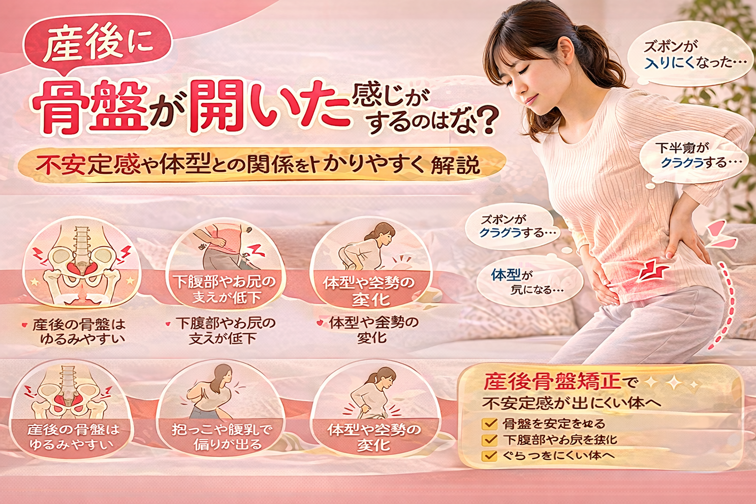 柏市周辺でも、産後の腰痛や恥骨痛だけでなく、骨盤が開いた感じや下半身の不安定感についてご相談いただくケースがあります。